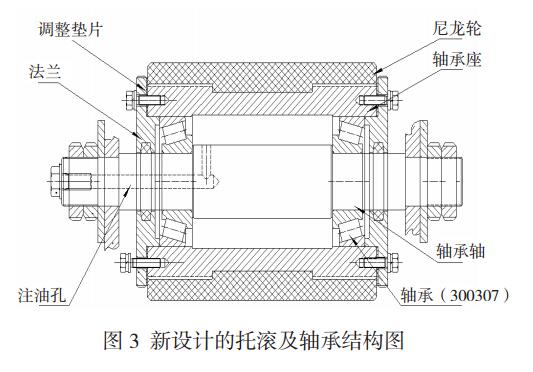 工作中,外圈旋轉(zhuǎn),內(nèi)圈安裝在軸承軸上且軸固定在支架上不動(dòng)。原滾揉機(jī)托滾及其軸承安裝結(jié)構(gòu)見圖 2。新設(shè)計(jì)的滾揉機(jī)托滾及其軸承結(jié)構(gòu)見圖 3。