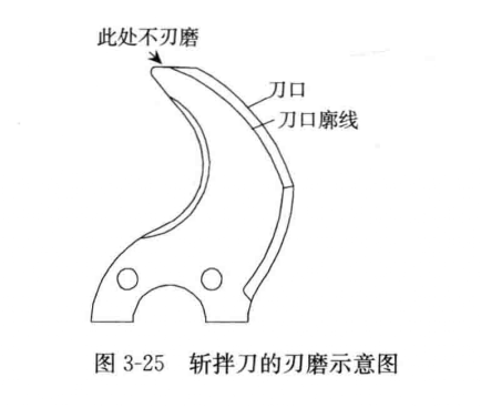 (2)開(kāi)動(dòng)機(jī)器,使刀與粗砂輪進(jìn)行摩擦,同時(shí)給磨刀輥施加一定壓力,促進(jìn)磨刀效果。要求在斬切刀刀尖處未開(kāi)刃,此部分不需刃磨(圖3—25)。